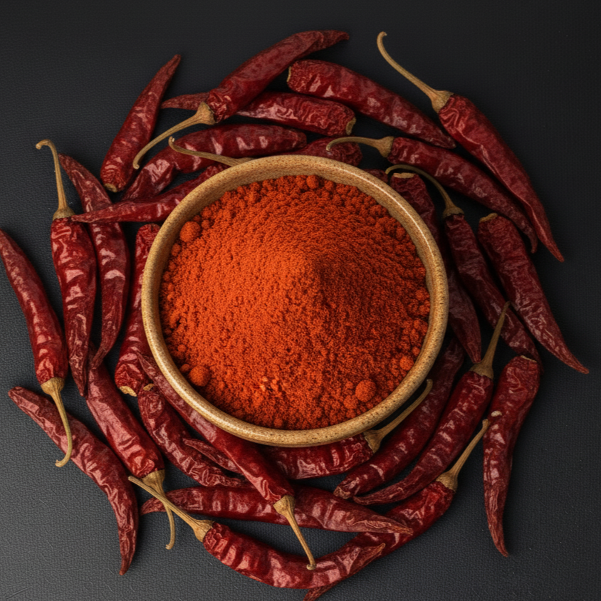 Vibrant red powder made from premium Byadagi chillies, offering mild heat and high color value for sauces and spice blends.